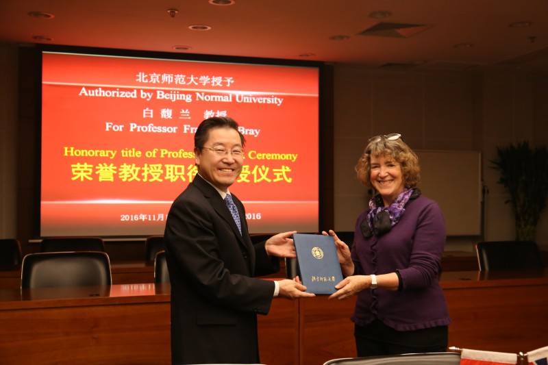 白馥蘭教授(Professor Francesca Bray)是現(xiàn)代國際漢學(xué)界、社會(huì)人類學(xué)界和科技史學(xué)界的頂尖學(xué)者,英國劍橋大學(xué)李約瑟研究所成員,英國皇家學(xué)院院士,國際科學(xué)史學(xué)會(huì)主席。白教授與北師大的聯(lián)系與中國民俗學(xué)之父鐘敬文教授主編《民俗學(xué)概論》有關(guān),書中《第八章 民間科技》吸收了李約瑟《中國科技史》的一些意見。近年白教授多次到我校訪問,自2016年起承擔(dān)了“跨文化學(xué)研究生國際課程班”的人類學(xué)與科技史課程。2016年11月11日,北師大授予白教授榮譽(yù)教授職銜儀式在學(xué)校會(huì)議室A414舉行,周作宇副校長代表學(xué)校向白教授授予榮譽(yù)教授證書,并發(fā)表講話,他說,白馥蘭教授學(xué)術(shù)背景深厚,學(xué)術(shù)成就卓越,其代表作之一,李約瑟《中國科技史》第六卷第二部分《農(nóng)業(yè)》一書,獲1985年法國國家文學(xué)歷史典籍研究布迪厄獎(jiǎng)最高獎(jiǎng)(Prix Bordin)。其專著《技術(shù)與性別:晚期帝制中國的權(quán)力經(jīng)緯》獲1999年國際科技史學(xué)會(huì)德克斯特獎(jiǎng)最高獎(jiǎng)(Dexter Prize)。其專著《世界史中的技術(shù)》獲2008年薩利·哈金獎(jiǎng)最高獎(jiǎng)(Sally Hacking Prize )。她自青年時(shí)代起深受李約瑟學(xué)術(shù)思想的影響,熱愛中國優(yōu)秀傳統(tǒng)文化,對(duì)華友好。她大力推進(jìn)中國歷代國家治理與地方多元文化并舉的獨(dú)特歷史文明,闡釋中國農(nóng)業(yè)技術(shù)文化的優(yōu)勢(shì),提出了許多學(xué)術(shù)前沿問題,增加了歐美學(xué)術(shù)界對(duì)中國歷史文明的認(rèn)識(shí),促使中國傳統(tǒng)優(yōu)秀文化元素產(chǎn)生廣泛的世界影響。希望白教授能與我校保持長期學(xué)術(shù)聯(lián)系,協(xié)助我校建設(shè)世界一流大學(xué),并繼續(xù)為中國重點(diǎn)高??萍际穼W(xué)、社會(huì)人類學(xué)和跨文化漢學(xué)的高級(jí)人才培養(yǎng)做出新貢獻(xiàn)。