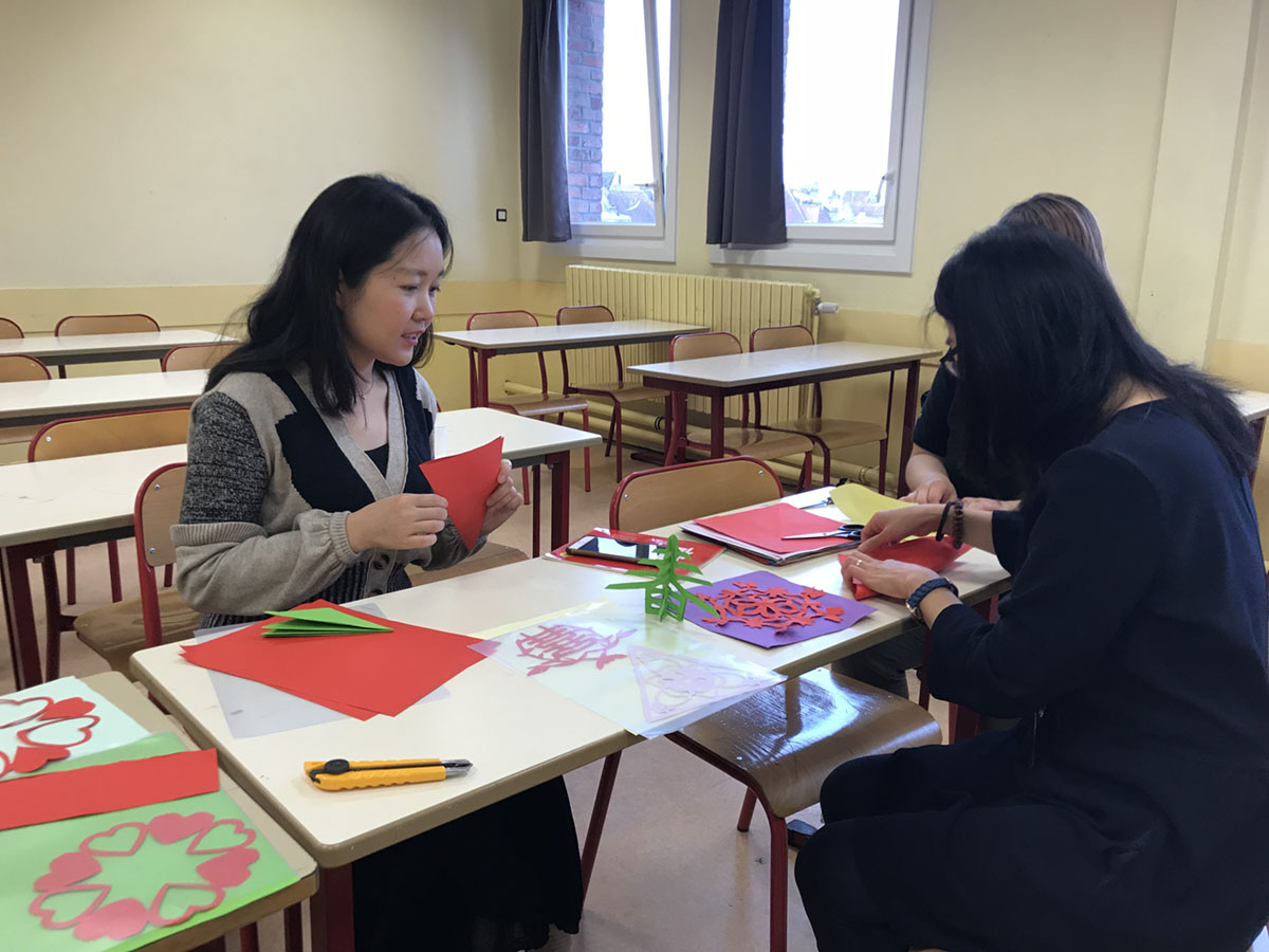 On December 7 2019, Chen Yunyun, Chinese teacher from the Confucius Institute of Artois, and Xing Jingyi, Chinese volunteer, were invited to Saint Jean Middle School to participate in the open day activities. Although it was a weekend, there were many people coming to the open day. This activity lasted for 2.5 hours, and about 150 people participated in the activities of paper cutting and Chinese calligraphy.