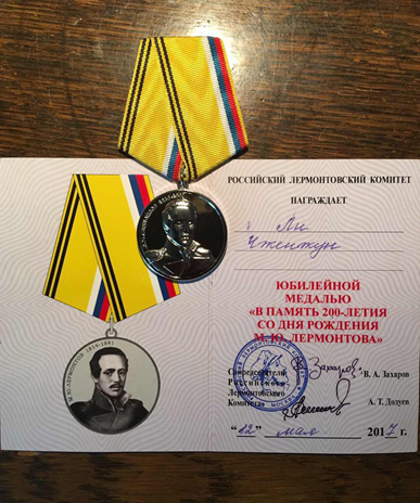 2014年是詩人萊蒙托夫誕辰200周年,俄羅斯境內(nèi)外舉辦了一系列紀念活動,李正榮參與了莫斯科(萊蒙托夫的出生地)、塔爾汗內(nèi)(萊蒙托夫度過童年少年的莊園)、皮亞季戈爾斯克(萊蒙托夫死亡地)等紀念活動,在車臣首府格羅茲尼的國際研討會上發(fā)表了關(guān)于萊蒙托夫詩學(xué)的學(xué)術(shù)論文,因其“研究題目有很大的創(chuàng)新意義”,莫斯科作家協(xié)會向李正榮教授頒發(fā)了萊蒙托夫獎?wù)?。這個獎?wù)率仟剟顬槎砹_斯文學(xué)作出貢獻的人士。