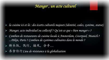 La conférence a débuté à 18 heures et s’est terminée à 20 heures. M. Bellassen, comme introduction, a tout d’abord défini la cuisine comme constitutive de l’identité d’un individu et d’une culture, mais, selon lui, la place qu’elle occupe est très différente d’un peuple à un autre. La cuisine chinoise a la particularité d'être tout à la fois, au même titre que la cuisine fran?aise, une culture, un système et un art. Ensuite, il a précisé qu’en Chine, pays qui à bien des égards possède la dimension d’un continent, la cuisine tient une place majeure au sein de la culture chinoise et du quotidien des Chinois. Elle est tout à la fois le reflet de la diversité du pays lui-même, de convenances traditionnelles et d’une conception du monde : elle accède au rang d’un véritable système. Sa variété est exceptionnelle et elle est structurée en nombreux sous-systèmes. Selon son analyse, la cuisine chinoise est régie par le principe philosophique d'équilibre (entre saveurs, couleurs, consistances, etc.) et rejoint dans ses principes des préoccupations diététiques. A la fin de sa présentation, un temps a été réservé aux questions des auditeurs.