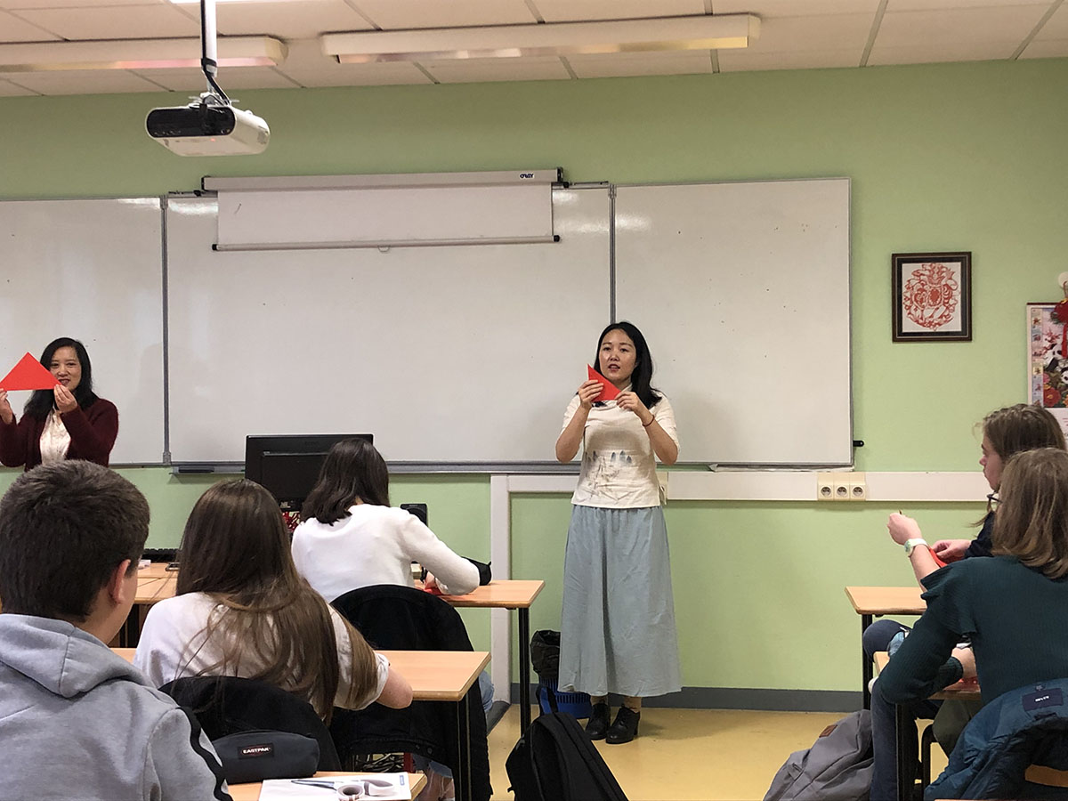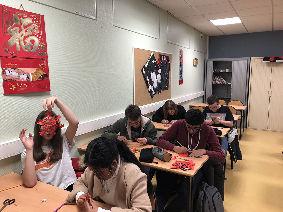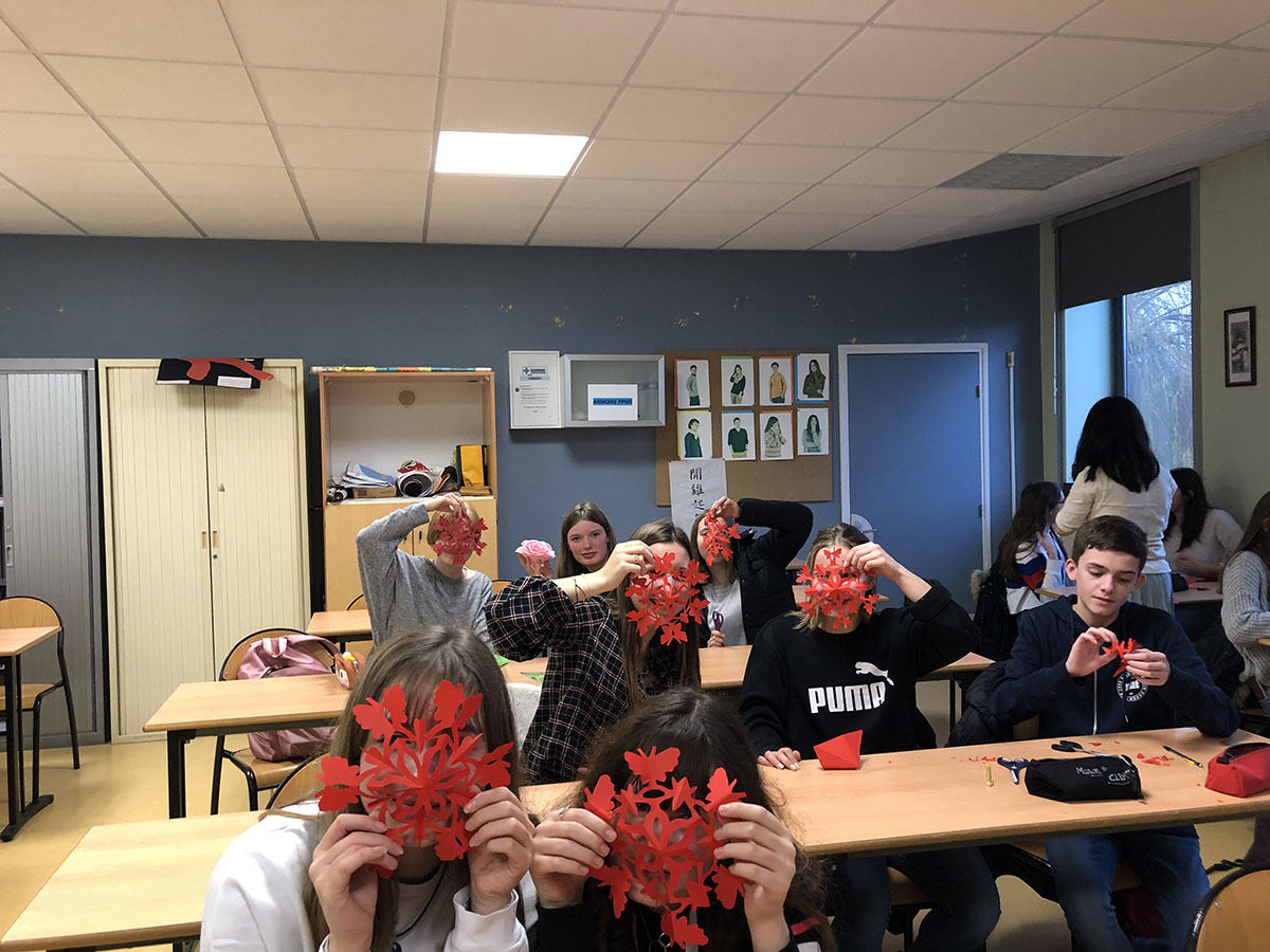 Le 17 décembre, Chen Yunyun, professeur de chinois à l'Institut Confucius d'Artois, et Cao Jing, bénévole dans le même établissement, ont surmonté les désagréments causés par la récente grève en France pour se rendre au lycée Beaupré à Haubourdin. Elles y ont organisé un cours de découpe de papier unique pour les étudiants ayant choisi le chinois en option. Au vu du nombre d’élèves présents (près d’une cinquantaine) 3 groupes ont été formés, permettant aux élèves comme aux professeurs de mieux apprécier l’activité.