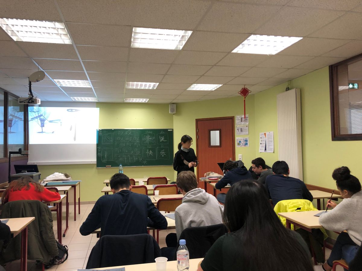 On December 4, 2019, Cao Jing and Gao Junyu, Chinese teacher volunteers of Confucius Institute of Artois were invited to Saint Paul Middle School in Lens to conduct Chinese Calligraphy courses for a total of 70 students in the three-level Chinese class at the school. All the students were divided into three classes and the event lasted for a total of three hours. Wang Siping, the Chinese teacher of the school, was there to assist two Chinese teacher volunteers to teach.