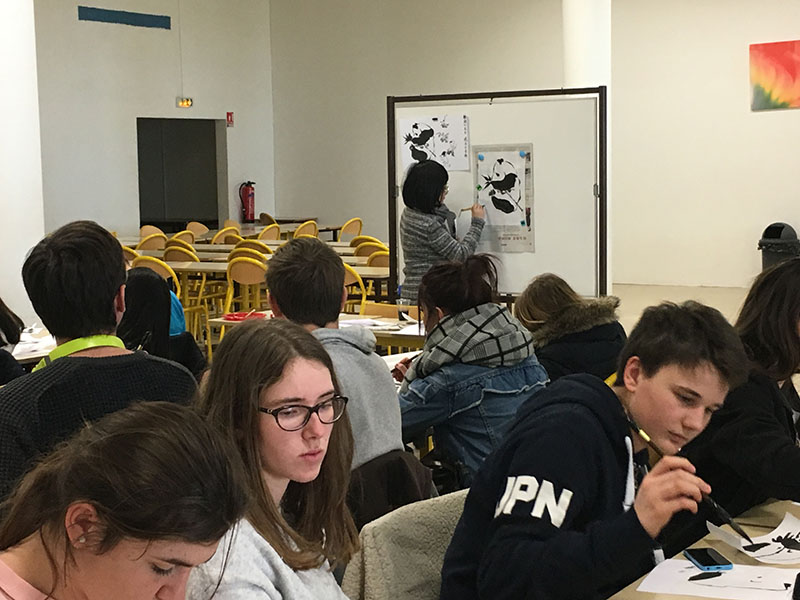2018年3月19日,法國阿爾多瓦孔子學院赴加萊顧拜旦高中講授中國文化體驗課,孔子學院中方院長吳朝陽教授和漢語教師志愿者楊玥前往講授書法和中國畫的課程。整個教學分三部分,吳朝陽院長帶學生領略了書法藝術,并用書法為每位學生題寫了中文名,楊玥引導學生用中國畫的方法畫了竹子、熊貓和貓,還帶去了中國傳統(tǒng)服飾供學生試穿體驗,課程生動有趣,現(xiàn)場氣氛十分活躍。顧拜旦高中的法國高中生約60人參加了聽講和實踐活動,整個教學為時2小時。這次教學加強了阿爾多瓦孔子學院與法國加萊地區(qū)中學的交流與合作,促進了中華傳統(tǒng)文化在法國當地的傳播。
