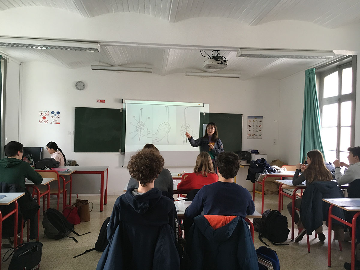 當(dāng)?shù)貢r間2020年1月30日,北京師范大學(xué)跨文化研究院副院長、法國阿爾多瓦大學(xué)孔子學(xué)院法方院長金絲燕教授所主持的方法孔子學(xué)院,在教師陳金秋、漢語教師志愿者曹靜和高駿瑜的帶領(lǐng)下,應(yīng)邀前往圣奧梅爾市Notre Dame de Sion中學(xué),為該校高一(15名學(xué)生)和高三(19名學(xué)生)中文班共計34名學(xué)生開展了書法課和太極課教學(xué)。這是阿爾多瓦孔子學(xué)院首次與圣奧梅爾市中學(xué)合作。本次授課兩個班級共計四個課時,其中書法兩個課時,太極兩個課時,持續(xù)時長共計四小時,該校漢語教師李琦全程在旁協(xié)助孔院教師進行授課。