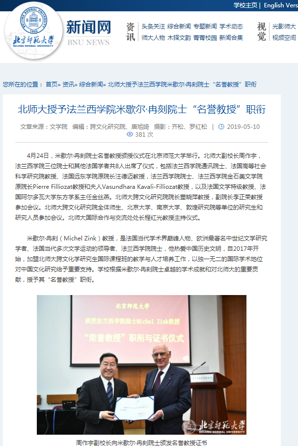 米歇爾·冉刻(Michel Zink)教授,是法國(guó)當(dāng)代學(xué)術(shù)界巔峰人物、歐洲最著名中世紀(jì)文學(xué)研究學(xué)者、法國(guó)當(dāng)代多次文學(xué)運(yùn)動(dòng)的領(lǐng)導(dǎo)者、法蘭西學(xué)院院士,他熱愛(ài)中國(guó)歷史文明,自2017年開(kāi)始,加盟北師大跨文化學(xué)研究生國(guó)際課程班的教學(xué)與人才培養(yǎng)工作,以獨(dú)一無(wú)二的國(guó)際學(xué)術(shù)地位對(duì)中國(guó)文化研究給予重要支持。學(xué)校根據(jù)米歇爾·冉刻院士卓越的學(xué)術(shù)成就和對(duì)北師大的重要貢獻(xiàn),授予其“名譽(yù)教授”職銜。