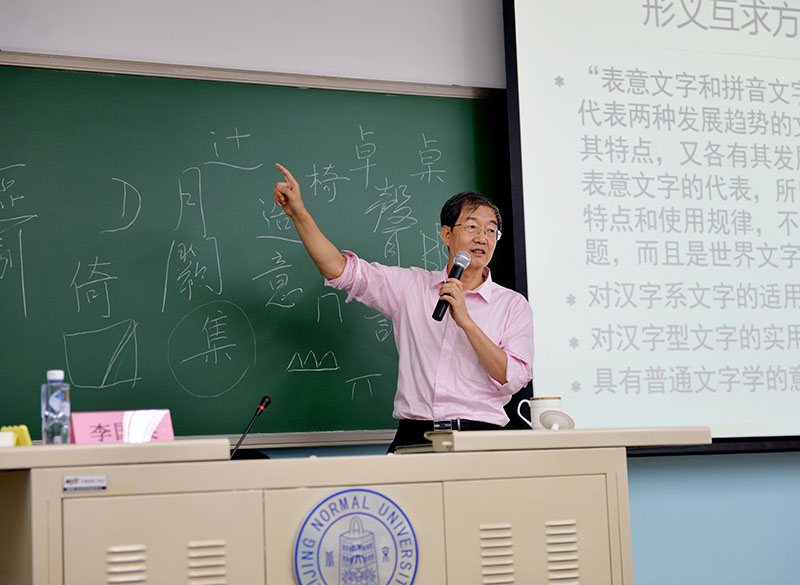 2018年8月25日,北京師范大學(xué)民俗典籍文字研究中心主任李國英教授為跨文化學(xué)研究生國際課程班授課,題目為《漢字個體字符的構(gòu)形分析與義符系統(tǒng)的描寫》。北師大跨文化研究院院長董曉萍教授主持講座,法國阿爾多瓦大學(xué)金絲燕教授與會。