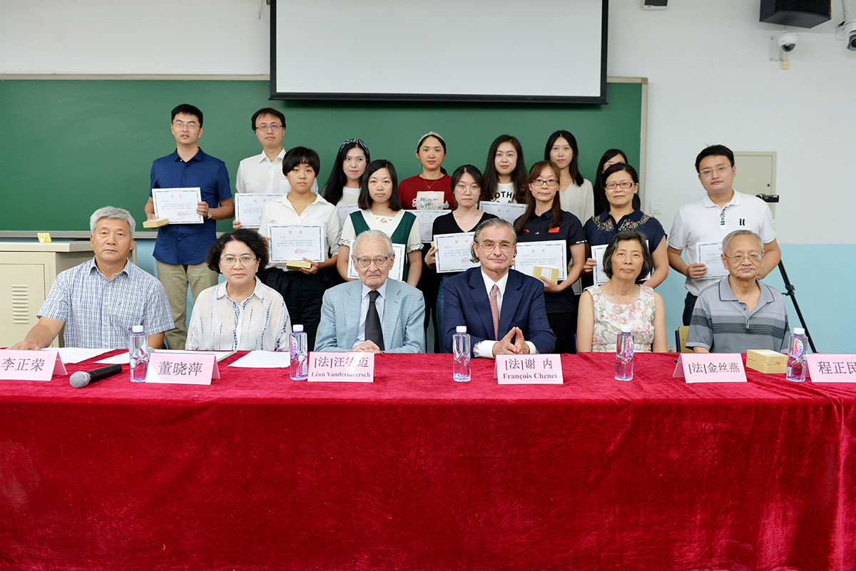 2018年8月28日下午,北京師范大學(xué)2018年跨文化學(xué)研究生國(guó)際課程班“跨文化的闡釋:社會(huì)、文化、民俗”,歷時(shí)9天,全面完成教學(xué)計(jì)劃,迎來(lái)結(jié)業(yè)典禮。下午2點(diǎn),結(jié)業(yè)式在北京師范大學(xué)教九樓103教室隆重舉行,為本次國(guó)際課程班前來(lái)授課的中外師資代表出席結(jié)業(yè)式,他們是:法蘭西學(xué)院通訊院士、法國(guó)高等社會(huì)科學(xué)研究院終身教授汪德邁(Léon Vandermeersch)先生,法國(guó)索邦大學(xué)印度哲學(xué)與比較哲學(xué)系主任謝內(nèi)(Fran?ois Chenet)教授,北京師范大學(xué)文藝學(xué)研究中心研究員、北師大跨文化研究院學(xué)術(shù)委員會(huì)主任程正民教授,法國(guó)阿爾多瓦大學(xué)文本與文化研究中心主任、北師大跨文化研究院副院長(zhǎng)金絲燕教授,中山大學(xué)教授、北師大跨文化研究院理事王賓教授、北師大跨文化研究院院長(zhǎng)董曉萍教授、北師大跨文化研究院副院長(zhǎng)李正榮教授。董曉萍教授和李正榮教授共同主持結(jié)業(yè)式。