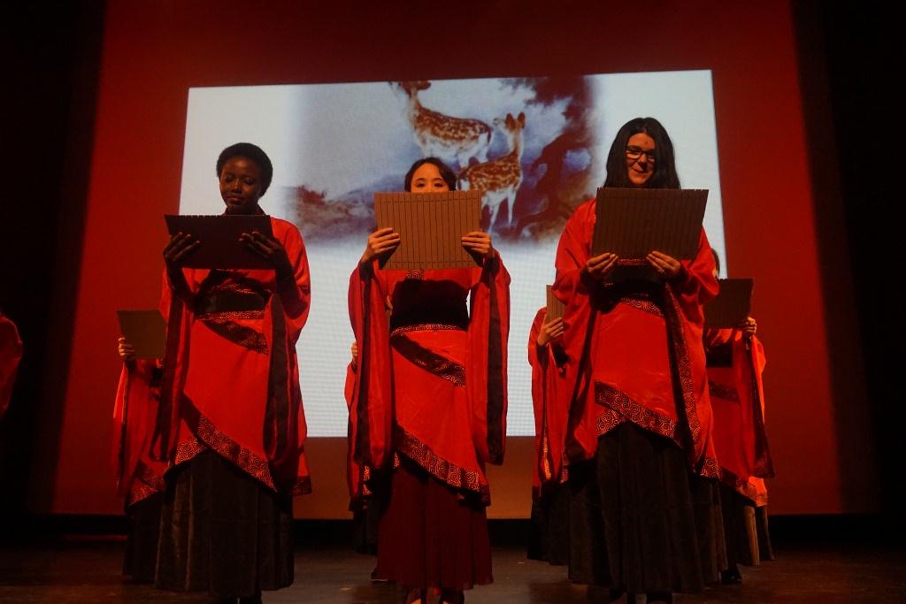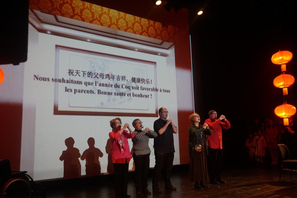 本次新年劇的籌備排練歷時兩個月,正如金絲燕院長在晚會上的新春致辭所提到的,這是孔子學院跨文化舞臺上由中法師生合作推出的藝術聯(lián)歡。參加演出的學中文學生,最小5歲,最大72歲?;I備工作扎實有效。新年劇一年前便被列入全年計劃,開始劇本寫作,提前兩個月就著手排練,準備諸如舞蹈、小品、話劇等集體節(jié)目難度很大,不僅需要才藝特長,更是需要大量時間和精力的投入。新年劇從籌備到上演極大底考驗了孔院團隊的奉獻精神、職業(yè)素養(yǎng)和責任意識。中方院長吳朝陽教授參加了演出??倢а菸何目评蠋煱滋鞂а?,晚間通宵修改劇本,進行舞臺背景視頻剪輯。漢語教師劉曼負責舞臺監(jiān)督,教師志愿者陳金秋負責三支舞蹈的排練,江愛群、楊競做了大量了文字編輯和劇目排練工作。漢學系學生和南大、中山大學、臺灣文化大學的交流生幾乎全部出動參與準備活動和演出。