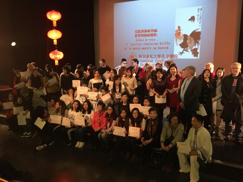 這是法國阿爾多瓦大學第三屆孔子中國藝術節(jié)的開幕式,新年劇《孔子的夢》設計巧妙,參與度高,覆蓋面廣,思想性強,融莊重、壯麗、喜慶和幽默于一體,以《孔子的夢》話劇為主線,穿插大學生、孔院學員、留學生、漢語教師以及南京大學、中山大學、臺灣文化大學交換生合作帶來的節(jié)目,包括《千字文》、《論語》、《鹿鳴》、《出塞》、《滿江紅》、《祖國啊,我親愛的祖國》等經(jīng)典古今詩歌吟誦,小品《生日快樂》,歌曲《我和我的祖國》,舞蹈《禮儀之邦》、《樓蘭少女》、《非洲舞蹈》,養(yǎng)生氣功五禽戲、雙人太極《化蝶》,古琴演奏《湘江怨》,大合唱《讓世界充滿愛》。演出結束后,由阿爾多瓦大學孔子學院法方院長金絲燕教授和中方院長吳朝陽教授聯(lián)合發(fā)表了新年致辭,并為參演師生頒發(fā)了榮譽證書。