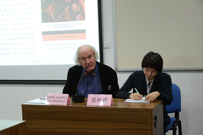 復(fù)旦大學(xué)德語系姜林靜副教授(右)翻譯 狄特·波西邁耶爾教授(左)與師生交流