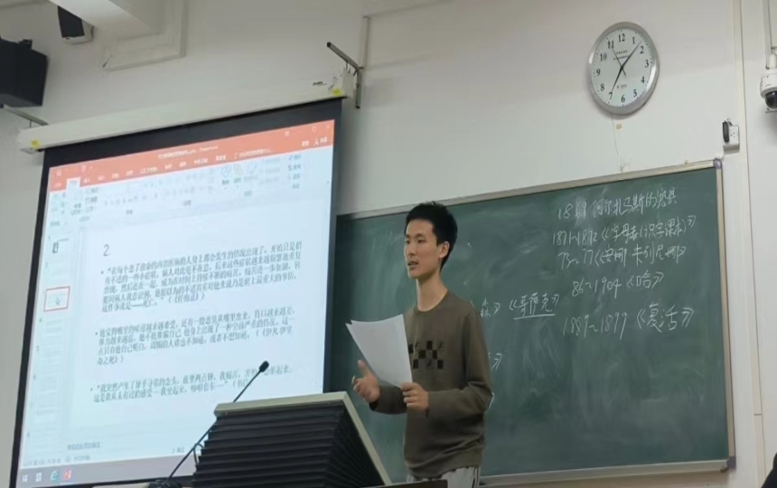 李正榮教授注重與聽講學生的互動,充分肯定了十五位同學豐富多彩的課堂展示,他們是:李雨桐《赫爾岑---用文學梳理私人與社會》、楊雨曦《屠格涅夫主題報告》、侯呼雷《列夫·托爾斯泰》、沈懿風《托爾斯泰的思想轉向》、于游川《謝苗諾夫的諜戰(zhàn)世界---<春天的十七個瞬間>及其他》、李鈺濤《陀思妥耶夫斯基與道德教育》、李奕圓《皈依上帝 vs 苦難與惡----論陀思妥耶夫斯基復調小說的救贖探索》、華潔瑩《陀思妥耶夫斯基寫作的瘋癲視角與審判鏡像》、龔雨薇《陀思妥耶夫斯基<作家日記>中衍生的思考》、熊婧雅《契訶夫筆下的女性形象分析-----看契訶夫女性觀及其成因》、黃鈺茜《契訶夫的另一重身份》、劉?,?/span>《安東·巴夫洛維奇·契訶夫----在冷酷的微笑中體察生活的殘酷》、楊艾艾《遇見契訶夫》、郭文慧《果戈理文學世界的狂歡化》、茍馨月《奧勃洛摩夫性格的形成原因探析》。