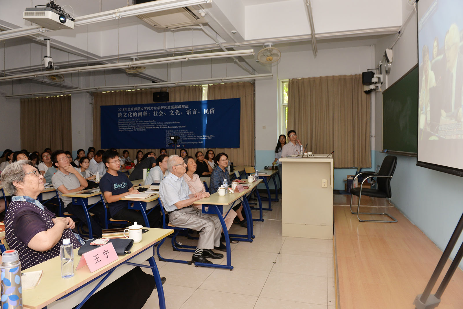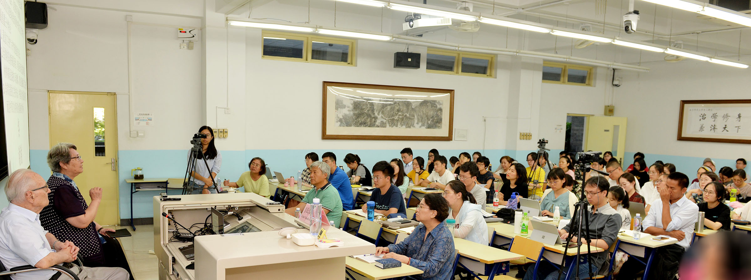 優(yōu)勢和局限。中國文言文有局限,但也有保持中國文化連續(xù)傳承的優(yōu)勢,這也是跨文化的意義,不是讓我們變成他者,而是通過交流對話,來改造和促進(jìn)我們自身的發(fā)展。既要發(fā)展,又要保存自己的特色。兩位先生學(xué)識淵博,侃侃而談,激發(fā)了在場全體師生的極大興趣,教室內(nèi)座無虛席,教室門口也擠滿了人。青年教師、博士研究生和碩士研究生紛紛提問,兩位先生耐心作答,不知不覺中時(shí)間飛逝而過。