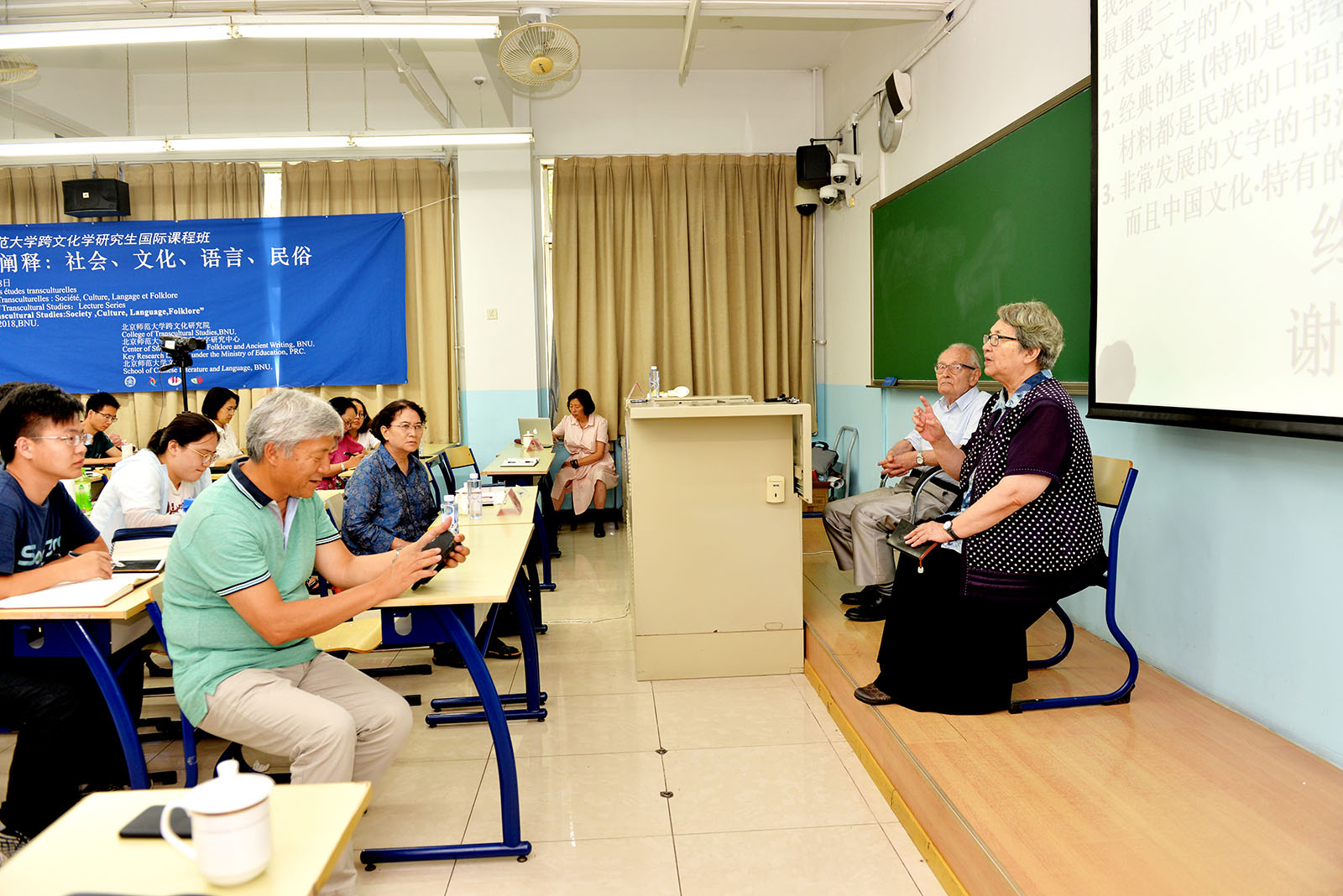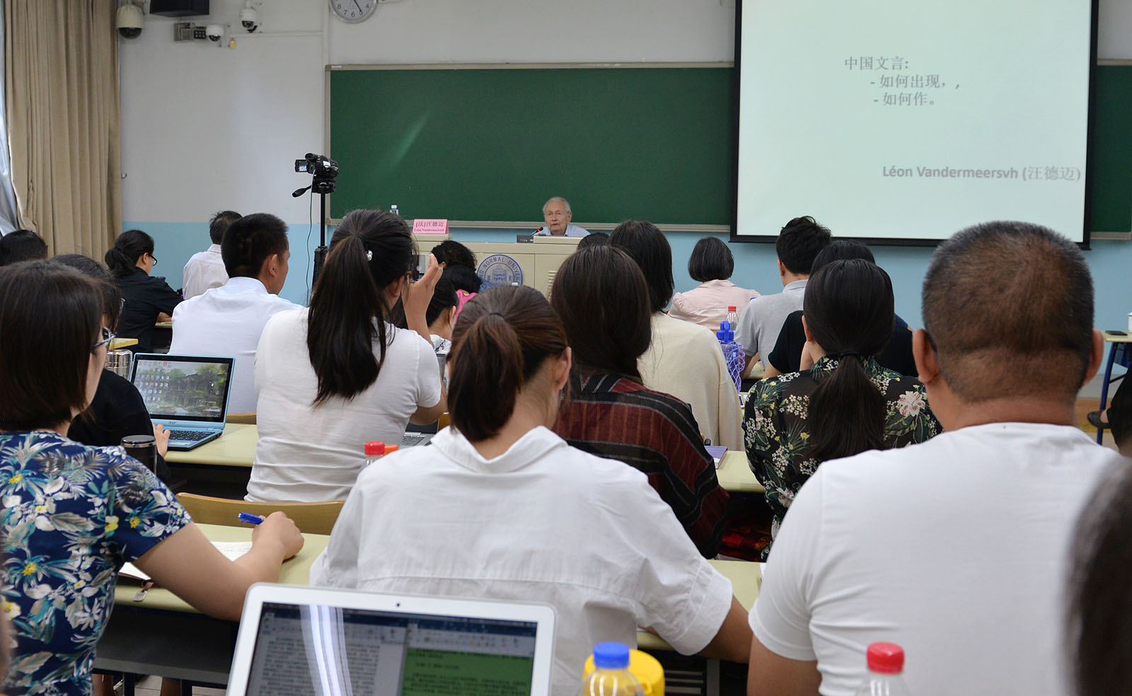 2018年8月23日下午,法蘭西學(xué)院通訊院士、法國高等社會科學(xué)研究院教授汪德邁先生在北師大教九樓103教室授課,題目為《文言在中國文化中的出現(xiàn)及其作用》,并就本講的觀點(diǎn)與北京師范大學(xué)資深教授、北師大跨文化研究院名譽(yù)院長王寧先生對話。王寧先生出席講座。法國阿爾多瓦大學(xué)文本與文化研究中心主任金絲燕教授主持講座,北師大跨文化研究院院長董曉萍教授和副院長李正榮教授到會。