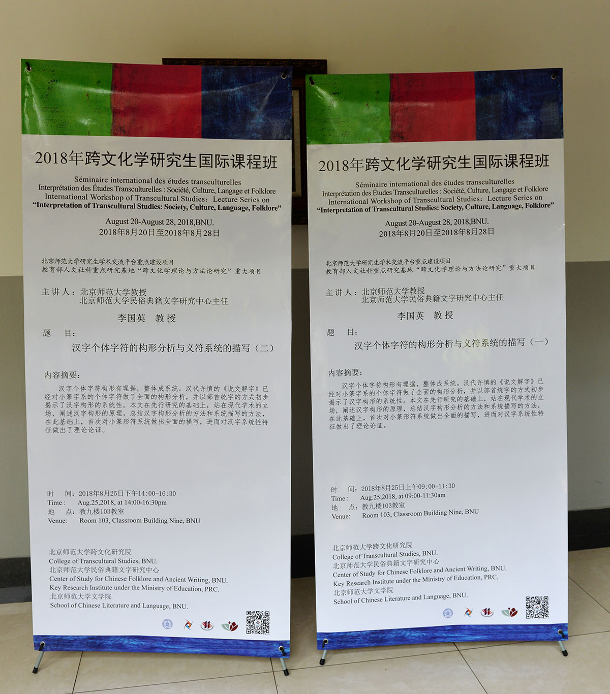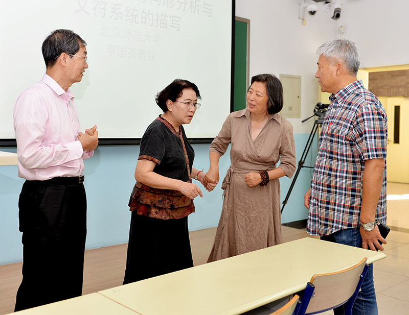 2018年8月25日,北京師范大學(xué)民俗典籍文字研究中心主任李國英教授為跨文化學(xué)研究生國際課程班授課,題目為《漢字個體字符的構(gòu)形分析與義符系統(tǒng)的描寫》。北師大跨文化研究院院長董曉萍教授主持講座,法國阿爾多瓦大學(xué)金絲燕教授與會。