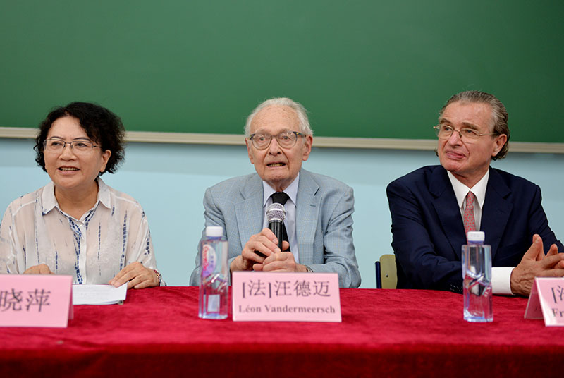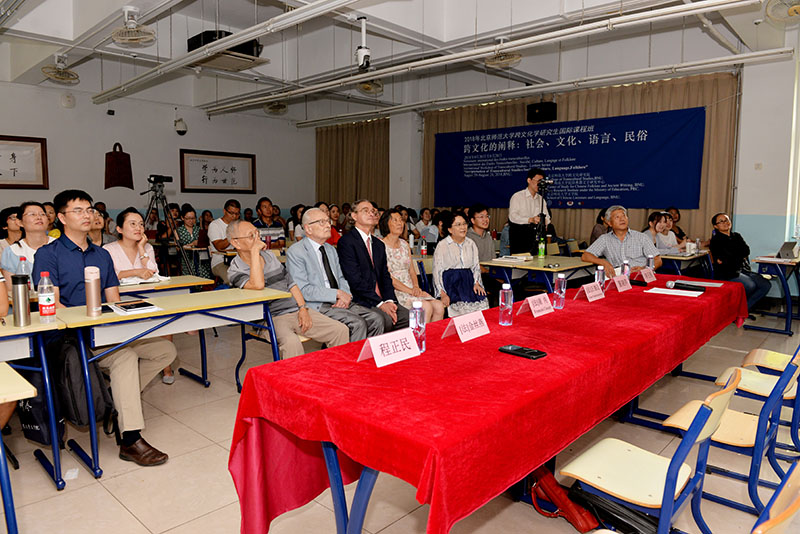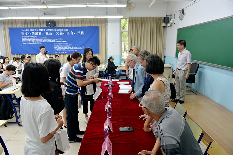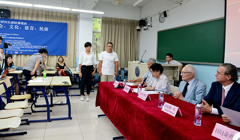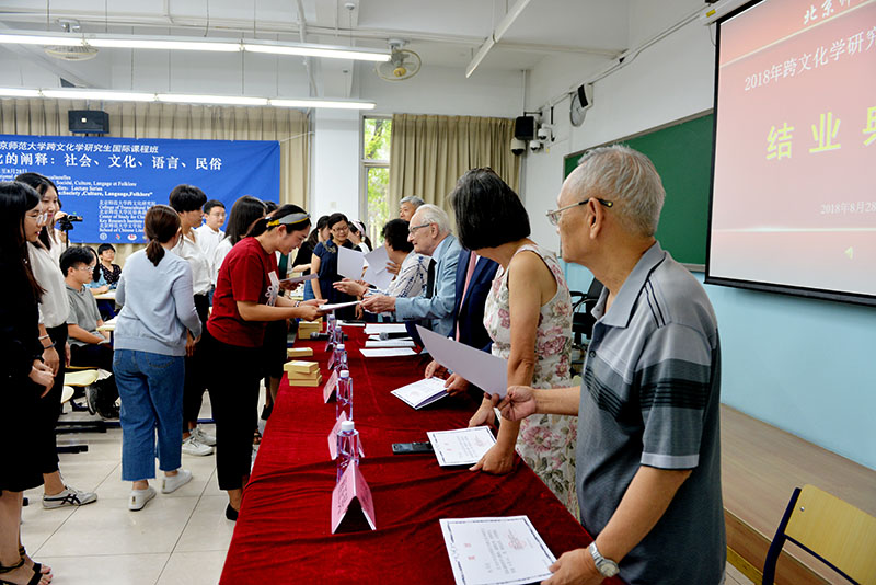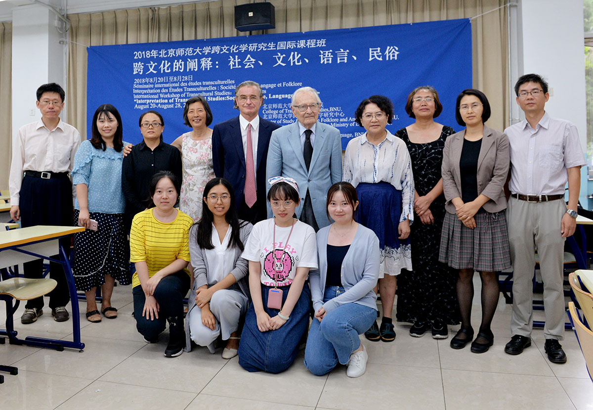 2018年8月28日下午,北京師范大學(xué)2018年跨文化學(xué)研究生國(guó)際課程班“跨文化的闡釋:社會(huì)、文化、民俗”,歷時(shí)9天,全面完成教學(xué)計(jì)劃,迎來(lái)結(jié)業(yè)典禮。下午2點(diǎn),結(jié)業(yè)式在北京師范大學(xué)教九樓103教室隆重舉行,為本次國(guó)際課程班前來(lái)授課的中外師資代表出席結(jié)業(yè)式,他們是:法蘭西學(xué)院通訊院士、法國(guó)高等社會(huì)科學(xué)研究院終身教授汪德邁(Léon Vandermeersch)先生,法國(guó)索邦大學(xué)印度哲學(xué)與比較哲學(xué)系主任謝內(nèi)(Fran?ois Chenet)教授,北京師范大學(xué)文藝學(xué)研究中心研究員、北師大跨文化研究院學(xué)術(shù)委員會(huì)主任程正民教授,法國(guó)阿爾多瓦大學(xué)文本與文化研究中心主任、北師大跨文化研究院副院長(zhǎng)金絲燕教授,中山大學(xué)教授、北師大跨文化研究院理事王賓教授、北師大跨文化研究院院長(zhǎng)董曉萍教授、北師大跨文化研究院副院長(zhǎng)李正榮教授。董曉萍教授和李正榮教授共同主持結(jié)業(yè)式。