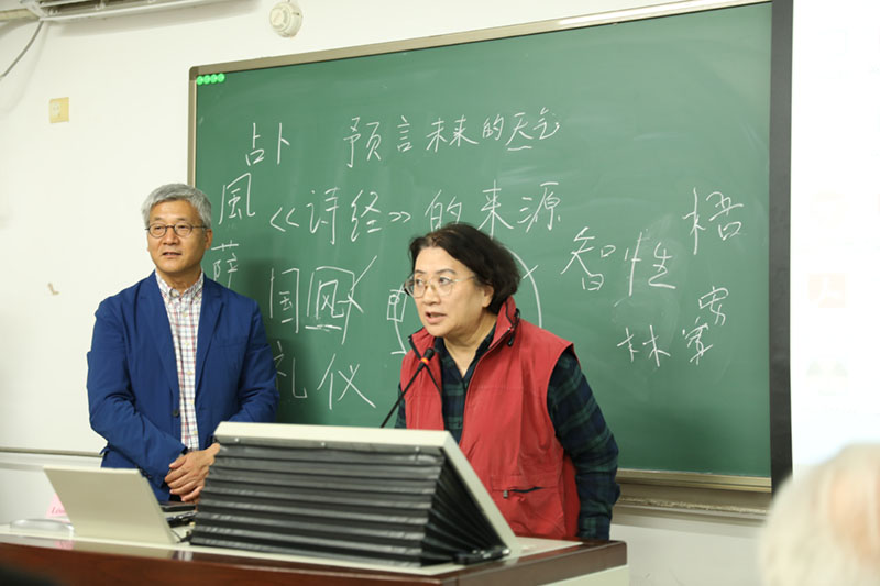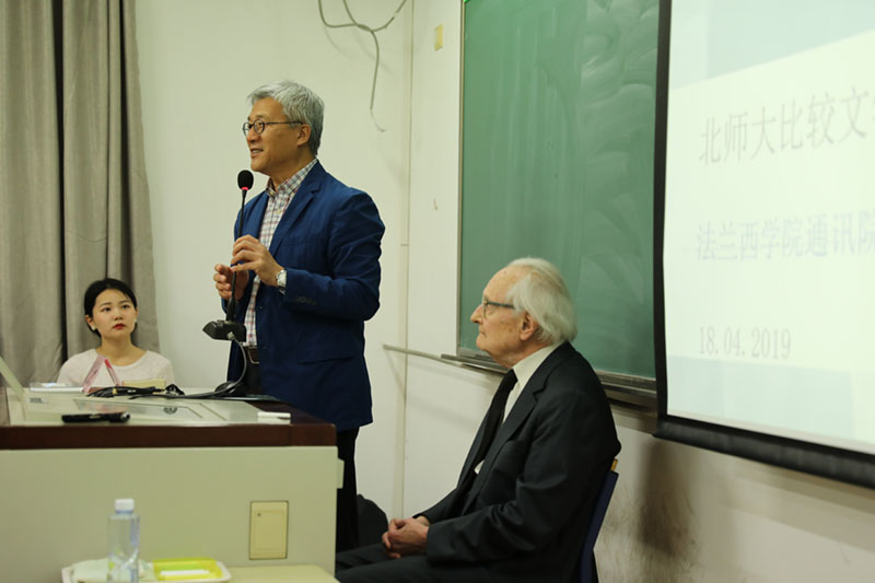 北京師范大學第五屆跨文化學課程班第二講,由法蘭西學院通訊院士、法國高等社會科學研究院汪德邁教授主講,這也是汪德邁教授今年4月來北師大講座的第二講,題目是《論〈詩經〉的起源》。北京師范大學文學院比較文學與世界文學方向的研究生、跨文化學方向的全體師生、北師大歷史學院、外文學院、教育學院和新聞傳播學院等多個院系的研究生、國內高級訪問學者和進修教師,國家漢辦科研人員代表、甘肅敦煌研究院、南京大學、山東大學等高校與科研院所的科研負責人和研究生等逾80人參加了聽講。法國阿爾多瓦大學特級教授、東方學系主任金絲燕教授、北京師范大學跨文化研究院院長董曉萍教授、北師大跨文化研究院副院長李正榮教授、北師大跨文化研究院史玲玲、賴彥斌老師等到場聽講。李正榮教授主持了本場講座。