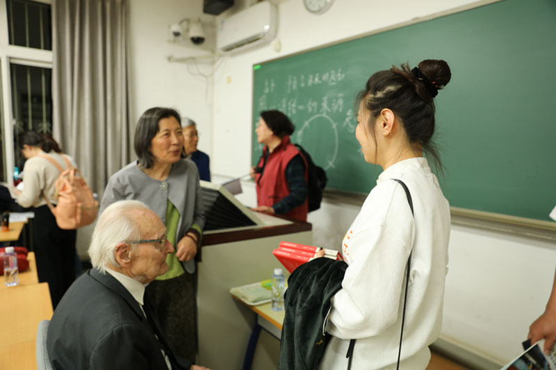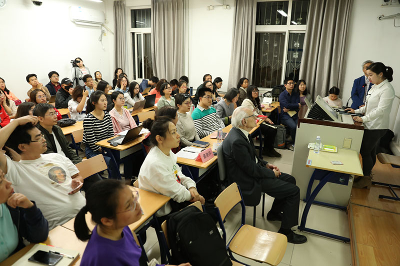 為達到跨文化、跨語言的教學目標和直接有效的對話效果,汪德邁教授全程用中文講座,汪老深厚的語言功力為現(xiàn)場聽眾所大為嘆服,現(xiàn)場不時爆發(fā)出掌聲和笑聲。整個116教室60個座位座無虛席,過道、門口和門外都擠滿了慕名而來的學者,聽講者四面八方前來和踴躍參與,展現(xiàn)對跨文化視野下的西方學者對中國經典文獻的研究的極大關注。鑒于汪德邁先生早年曾在日本從事漢學研究多年,對日本社會文化也有很深的了解,在汪德邁先生結束講座后,四位北師大比較文學與世界文學的研究生走到臺前,向汪老和在場師生展示了他們的課堂學習報告,與汪老積極對話。青年研究生的參與,得到現(xiàn)場中外教師的贊許,一場代際思想交匯呈現(xiàn)出跨文化學研究向多維度延展的可能性。