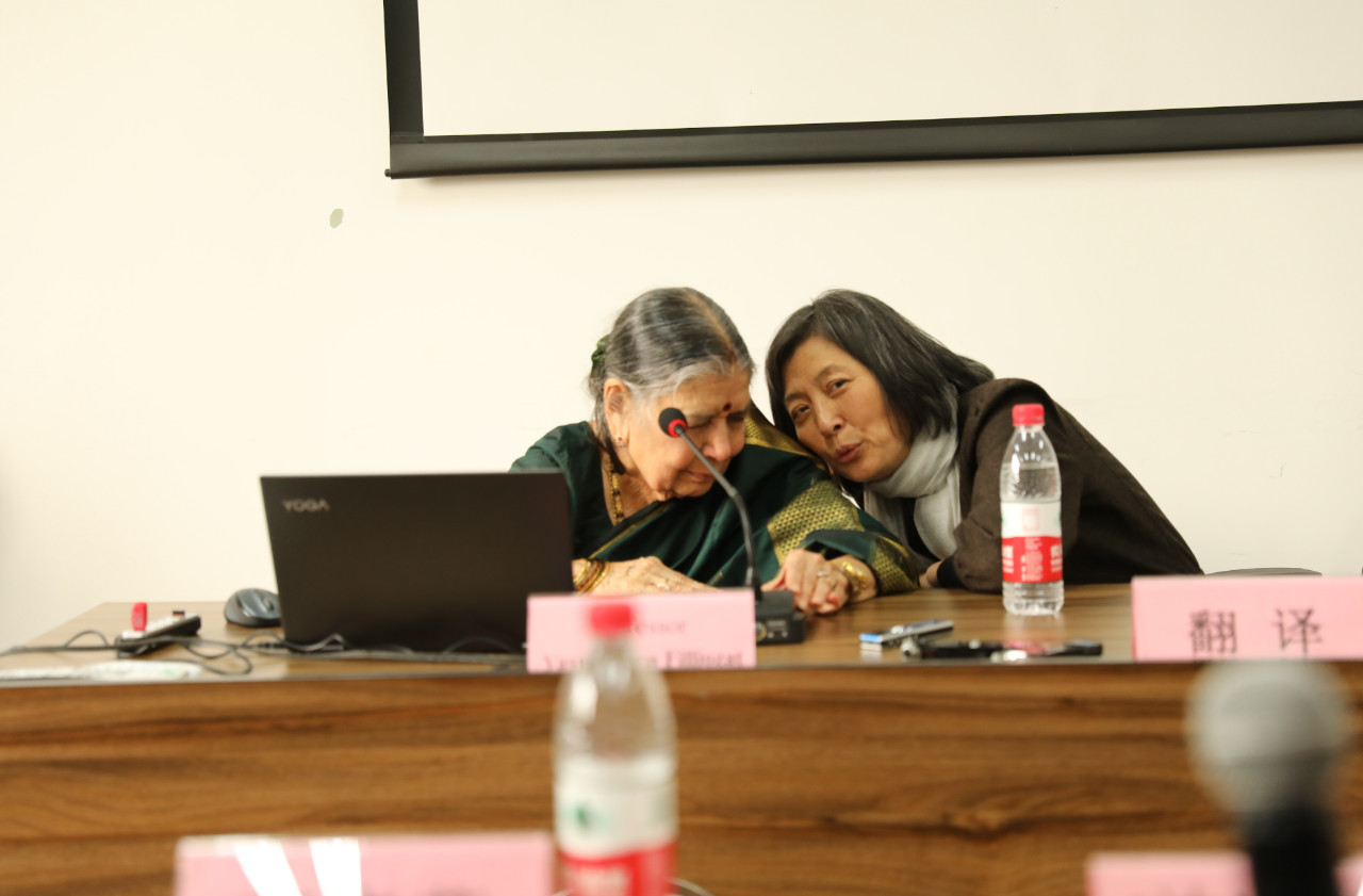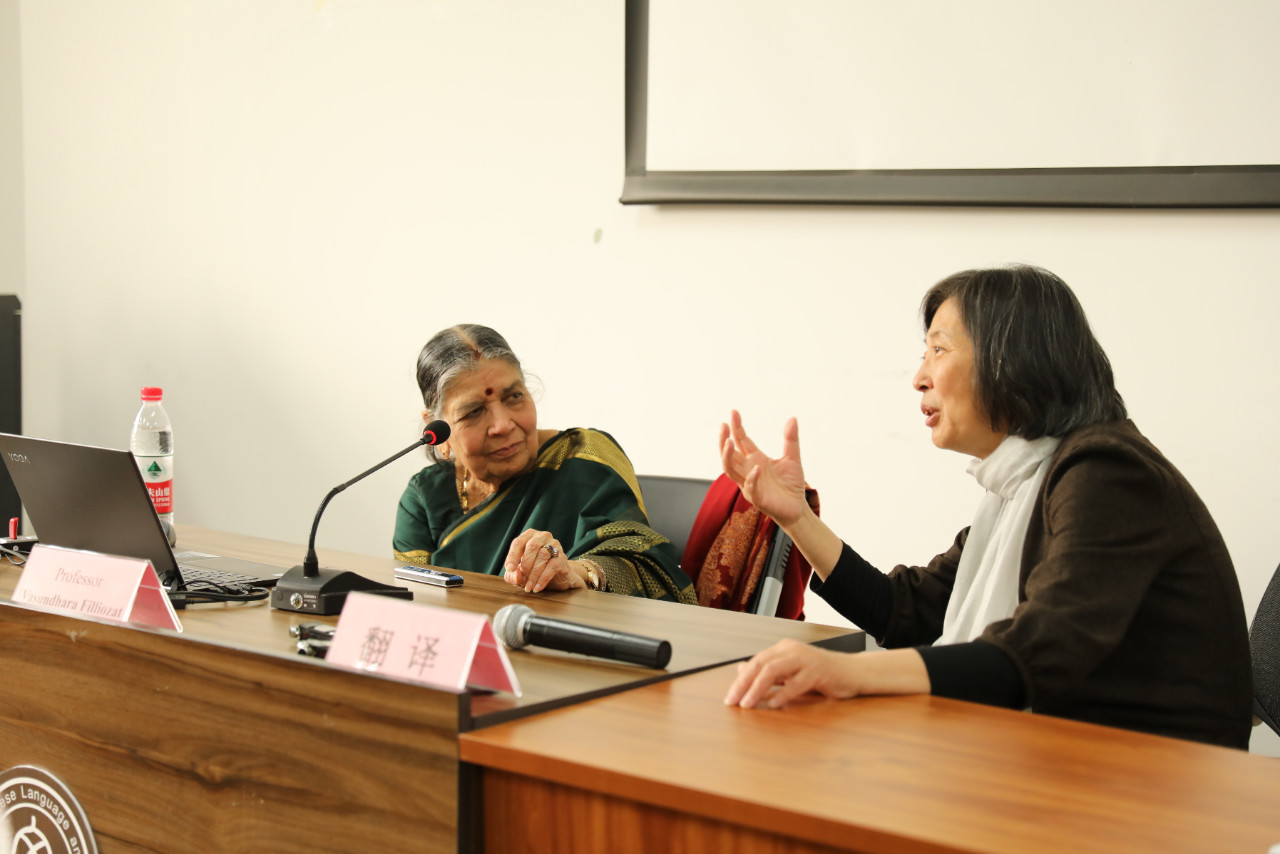 Vasundhara Kavali-Filliozat教授在印度德里大學(xué)獲得歷史學(xué)碩士學(xué)位,后于法國索邦大學(xué)獲得印度學(xué)博士學(xué)位,本課所講得印度南方卡納塔卡邦正是她的故鄉(xiāng)。她出生于一個(gè)博學(xué)家族,自幼接受特殊的家庭教育。后來遠(yuǎn)嫁法國,仍然與丈夫半年居住法國、半年居住印度進(jìn)行調(diào)查研究,過著雙邊定居的生活。她以超然而親密的身份,對印度南部宗教文化常年研究,從青年時(shí)代到步入晚年未曾間斷,構(gòu)建了個(gè)人的跨文化人生之旅。她的子女出生在法國,是講法語的一代,但在他們夫婦的教育下,也能熟練地演唱印度古老的戲劇《沙恭達(dá)羅》,是家族中印度經(jīng)典文化的新傳人。這是她第二次訪問中國,第一次是到上海,這次是來北京。講座之余,她參觀了北京的故宮、天壇和長城等世界文化遺址,還去西安參觀了唐玄奘赴印度取經(jīng)前出發(fā)的千年圣地。她比較中西印之間綿長的歷史文化相似物與差異性,所思所悟又成為在北師大講學(xué)的一種補(bǔ)充。
