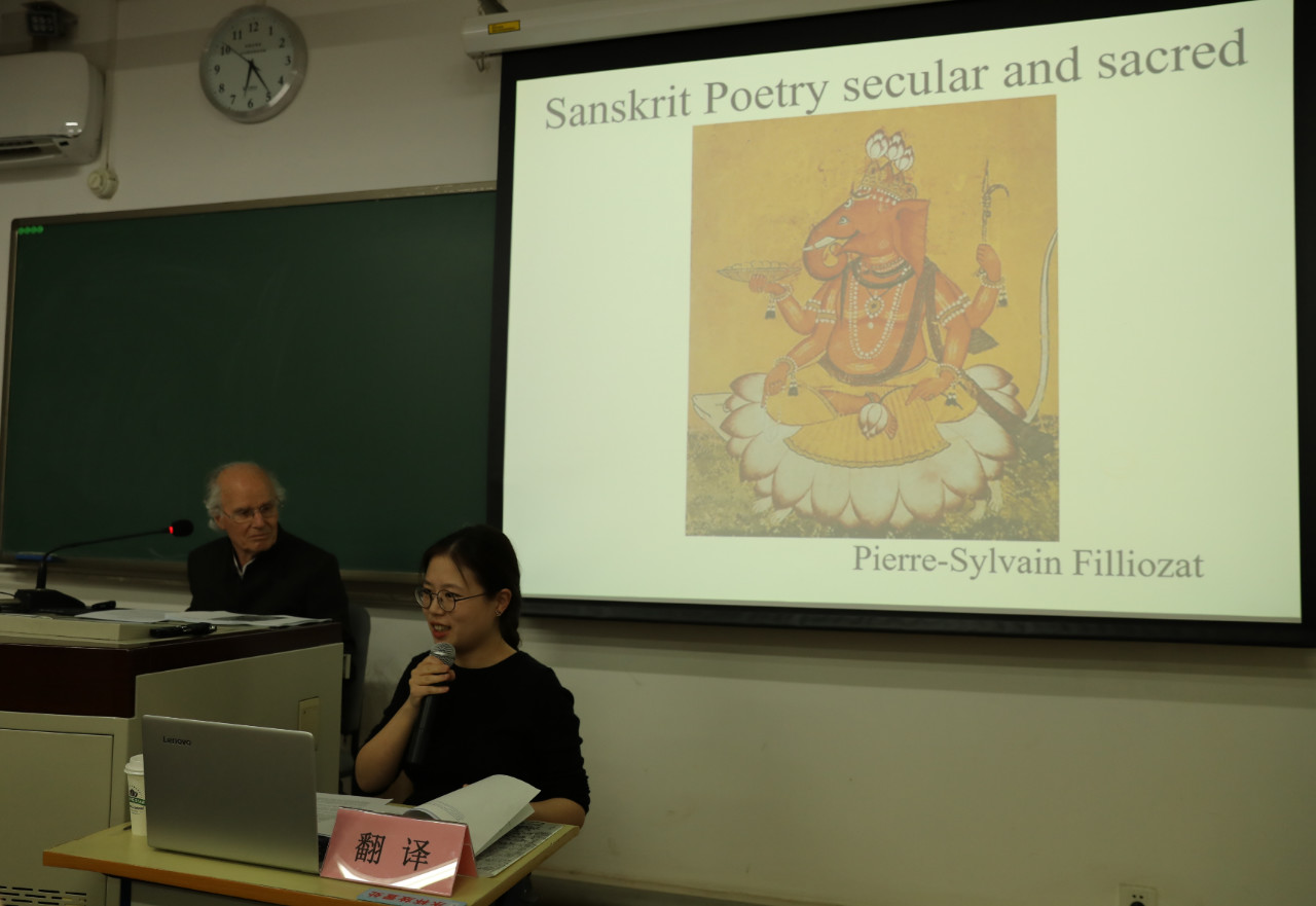 北京師范大學(xué)第五屆跨文化學(xué)課程班繼續(xù)介紹法國(guó)學(xué)術(shù)界對(duì)印歐文化圈中的印度詩學(xué)研究成果。本講由法國(guó)著名印度學(xué)研究專家、法蘭西學(xué)院院士、法國(guó)高等社會(huì)科學(xué)研究院Pierre-Sylvain Filliozat教授擔(dān)任主講,題目是《印度古代詩學(xué)的概念:梵文詩》,從法國(guó)詩學(xué)和跨文化研究的視角,將概念、闡釋與文本誦讀結(jié)合,揭示印度古老詩學(xué)的文化內(nèi)涵及其與西方詩學(xué)的差異。