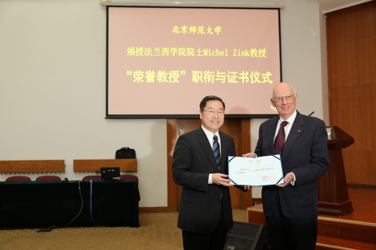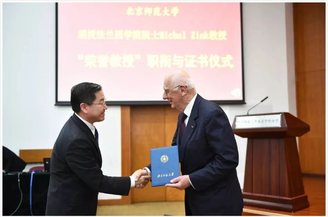 法國當(dāng)代學(xué)術(shù)界巔峰人物、歐洲最著名中世紀(jì)文學(xué)研究學(xué)者、法國當(dāng)代多次文學(xué)運(yùn)動(dòng)的領(lǐng)導(dǎo)者、熱愛中國歷史文明的法蘭西學(xué)院院士米歇爾·冉刻(Michel Zink)教授,自2017年開始,加盟北京師范大學(xué)跨文化學(xué)研究生國際課程班的教學(xué)與人才培養(yǎng)工作,以獨(dú)一無二的國際學(xué)術(shù)地位對(duì)中國文化研究給予重要支持。北京師范大學(xué)根據(jù)米歇爾·冉刻院士卓越的學(xué)術(shù)成就和對(duì)北京師范大學(xué)的重要貢獻(xiàn),授予其“名譽(yù)教授”職銜。