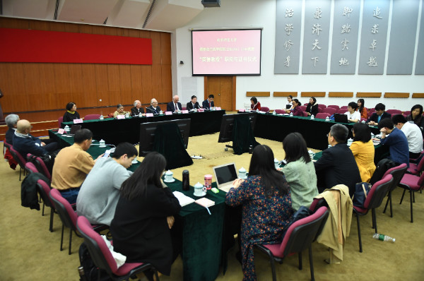 2019年4月24日,在北京師范大學(xué)英東樓學(xué)術(shù)會(huì)堂,正式舉行頒授儀式。北師大國際合作與交流處處長(zhǎng)程紅光教授主持儀式。北京師范大學(xué)周作宇副校長(zhǎng)出席儀式。法蘭西學(xué)院三位院士和其他法國學(xué)者共8人出席了儀式,包括:法蘭西學(xué)院通訊院士、法國高等社會(huì)科學(xué)研究院教授、法國遠(yuǎn)東學(xué)院原院長(zhǎng)汪德邁教授,法蘭西學(xué)院院士、法蘭西學(xué)院金石美文學(xué)院原院長(zhǎng)Pierre Filliozat教授和夫人Vasundhara Kavali-Filliozat教授,以及還有法國文學(xué)特級(jí)教授、法國阿爾多瓦大學(xué)東方學(xué)系主任金絲燕。北京師范大學(xué)跨文化研究院院長(zhǎng)董曉萍教授和北京師范大學(xué)跨文化研究院副院長(zhǎng)李正榮教授到會(huì)。北京師范大學(xué)跨文化研究院全體師生、北京大學(xué)、南京大學(xué)、敦煌研究院等單位的研究生和研究人員參加了會(huì)議。北京師范大學(xué)電視臺(tái)記者到會(huì)。